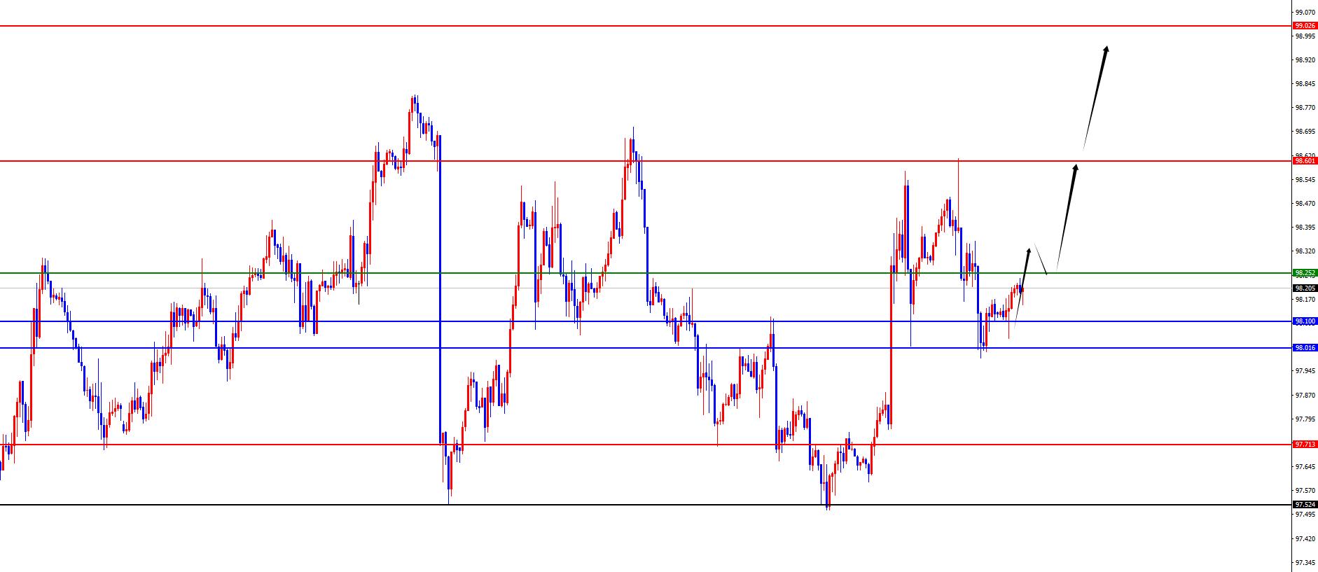 From a multi-cycle analysis, the weekly level has recently been the key consolidation of the weekly line. Currently, the weekly line resistance is in the 98 area, and the price breaks upward again on Tuesday. Yesterday, the price continued to fall back. At this point, it continues to treat more according to the oscillation and the medium-term line. From the daily level, we need to pay attention to the 98.10 regional support for the time being, so as long as the current price does not close, it will continue to be more biased than the daily and weekly support. We will temporarily pay attention to the 98.25 area in four hours, and will continue after standing firmly. There are also many in one hour now, and the focus above is on the 98.60-99 area.
