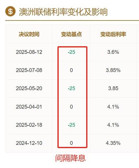 This Tuesday at 12:30, the RBA will announce the results of the September interest rate resolution, and mainstream expectations believe that it will maintain the benchmark interest rate of 3.6%. Since the beginning of this year, the RBA has cut interest rates three times, with a cumulative increase of 75 basis points, and the latest rate cut occurred in August. According to historical data, the RBA follows the strategy of "interval interest rate cuts", that is, after the interest rate cut in August, it suspends interest rate cuts in September, and then cuts interest rates again in November. According to economic data, Australia's annual GDP growth rate in the second quarter was 1.8%, rising for three consecutive months. The core inflation rate in the second quarter was 2.7%, down ten consecutive periods. The latest unemployment rate is 4.2%, below the 5% alert level. The total export volume in July was 46.02 billion Australian dollars, hitting a record high in nearly 21 months. Overall, Australia's economic data performed well, and there is no need to significantly lower interest rates, supporting the RBA's judgment that the benchmark interest rate remains unchanged this week.