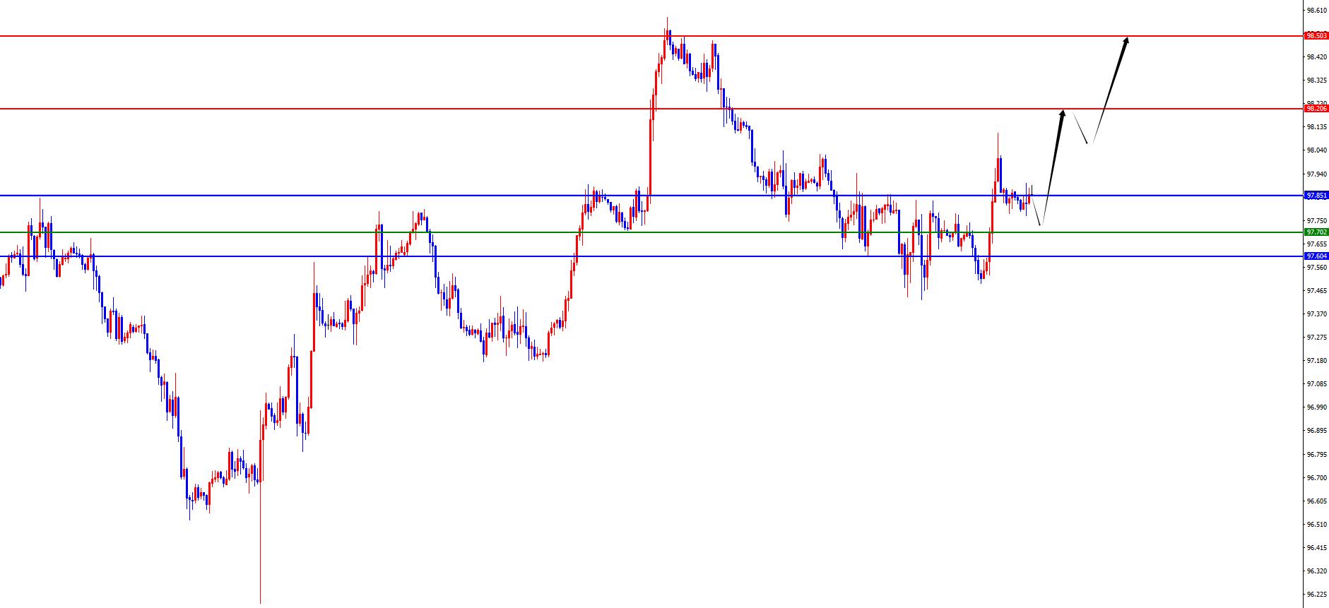 From a multi-cycle analysis, the price has been consolidating in the weekly level recently. Currently, the weekly line supports the 97.85 area, and at the same time, the price has been in the last week's resistance, and the bulls continue in the medium term. From the daily level, as time goes by, the daily line is currently supported in the 97.60 area, and the band above this position of the price has further risen. From a four-hour perspective, yesterday's US trading broke through the four-hour resistance position, and the previous resistance became support. Currently, the focus is on the 97.70 position, and the price is short-term bullish treatment above this position. There is currently a short-term adjustment in one hour. After the price falls back to the four-hour support area, it will continue to pay attention to the rise. Focus on the 98.20-98.50 area above. Once it breaks through 98.50, the bulls will continue.