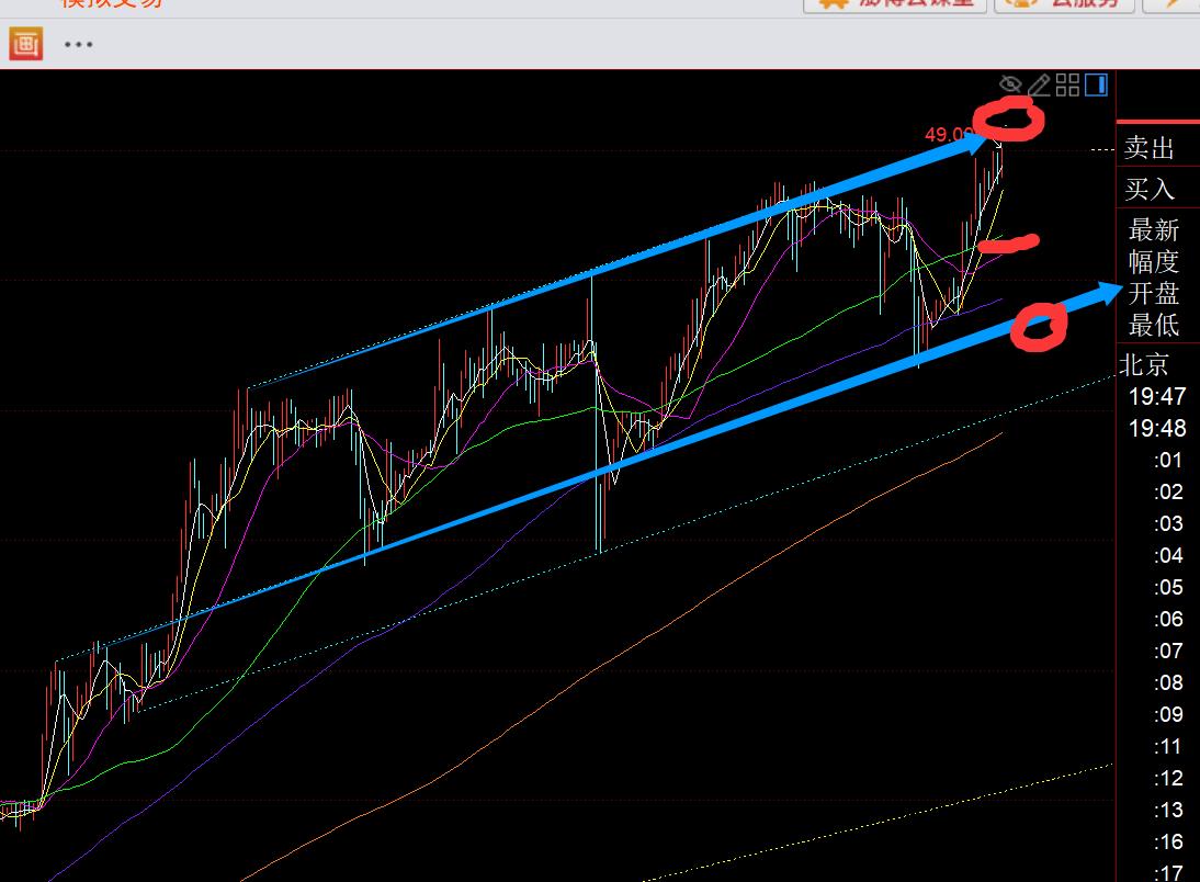 白银方面:昨日白银弱,今日在黄金带动下,也有所V回去了;不过从通道看,还处于蓝色通道内运行,今晚留意上轨阻力49.15一线,中轨支撑48.2,下轨支撑47.65,未打破通道,就维持上下轨之间运行;