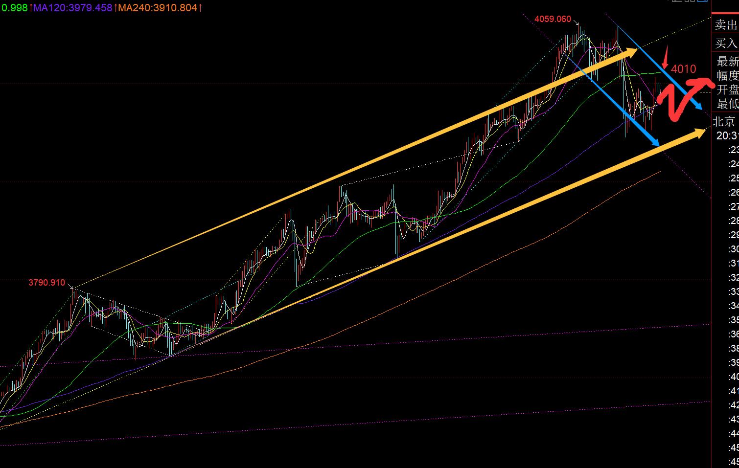 第三,黃金小時線級別:隔夜打壓一波,收盤前小幅反彈,今日一早先小幅急跌至3958企穩拉升一波至3894,承壓再午後回落一波至3947低位,歐盤企穩3952又拉升一波至4006,日內整體當下走勢來看,就是在進行震盪式緩慢偏上行反彈;布林帶急速縮口,上軌4010一線,剛好也是圖中藍色下滑通道的上軌處,也是66日均線承壓點,所以4010這個位置尤為重要,只有突破站穩它,才能徹底結束下調,轉為強勢拉升;中軌支撐是3978,下軌支撐3960-3950範圍,前期黃色通道下軌位置上移3935;由於歐盤向上反彈,且刺破了亞盤高點,雖未站穩,但起碼整個歐盤不是弱勢,所以今晚應該回踩還有一波上行;若先回踩,留意3978-79、3960-50兩個支撐點企穩看漲,目標阻力4010一線;若先反彈衝擊4010出承壓則看一波回落下行;暫時維持4010-3950這個範圍內,布林帶上下軌內震盪整理;參考10月3日走法,4010一線承壓回落一波,再企穩3950-4010的618分割位置進行上攻(大概397幾),去突破站上4010逐步發力走強,這是預計比較理想的推演,走一步看一步;