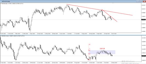 上圖為NZDUSD日線(上)和周線(下)的疊加圖。日線級別呈現波浪下跌模式,每一輪下跌波之後,都會出現比較顯著的反彈波段。雖然中期趨勢是空頭,但由於頻繁出現反彈波段,導致操作NZDUSD的短線交易並不順利,需要時刻警惕行情觸底反彈。