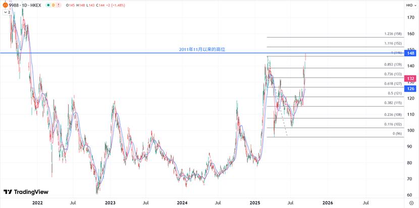 The breakthrough layout in AI has allowed Alibaba to continue to leap forward in AI narrative-driven valuation improvement. With the multiple concepts of "e-commerce recovery" + "AI breakthrough" + "restructuring value release", the stock price is also rising at a high momentum. It has risen by 50% since the April low and has now hit a high since November 2011. If it continues to surpass HK$150, it will open up new upward space and look toward HK$170.