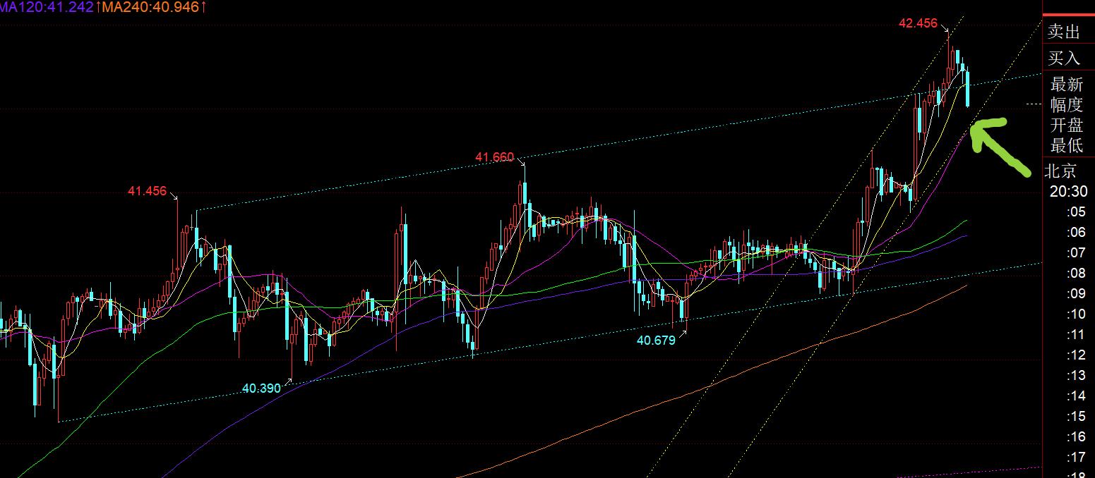In terms of silver: Asian and European sessions continue to rise unilaterally, and the US moves back before the session. Tonight, pay attention to the lower track of the middle channel, which is also the middle track of the hourly line, about 41.9. If you can stabilize it, you will continue to be bullish and look at the gains and losses of the intraday high point;