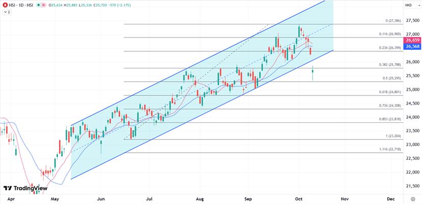 A medida que la situación xmltrust.comercial volvió a ponerse tensa, las acciones de Hong Kong volvieron a experimentar pánico esta mañana, con el índice de volatilidad disparándose casi un 29%, alcanzando un nuevo máximo desde mayo de 2025. Después de la fuerte caída a corto plazo, el mercado puede recuperar cierta calma al margen, a la espera de posibles negociaciones entre los dos países. Sin embargo, después de que el mercado de valores de Hong Kong cayera a su nivel más bajo en más de un mes, rompió el canal alcista. La presión a la baja a corto plazo persiste. Mantener la marca de 25.000 es la clave para reiniciar el rebote.