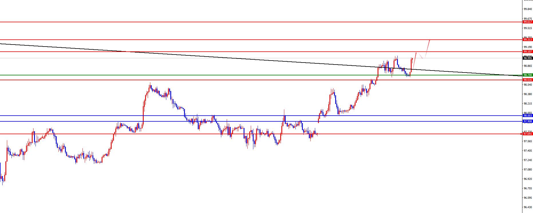 Du point de vue de l'analyse multi-cycles, au niveau hebdomadaire, le prix s'est récemment consolidé de haut en bas de la ligne hebdomadaire clé. Le support hebdomadaire actuel se situe dans la zone 97,90. Nous continuerons à prêter attention au prix clôturant au-dessus de cette position sur une base hebdomadaire. Une fois clôturée au-dessus de cette position, la ligne médiane augmentera par la suite. À partir du niveau quotidien, au fil du temps, le support quotidien actuel se situe dans la zone 98 et la bande de prix au-dessus de cette position augmentera encore. Dans une perspective de quatre heures, le prix était sous pression au niveau de résistance de quatre heures au début de la semaine dernière. Le prix a franchi et augmenté jeudi dernier, puis est revenu à la ligne quotidienne et au support de quatre heures vendredi. Le support global sur quatre heures se situe actuellement à 98,60-70, et le prix reste longtemps au-dessus de cette position à court terme. Sur l'heure, le prix a fluctué près de la ligne de tendance soulignée hier. À l'heure actuelle, le court terme est toujours haussier, donc pour le moment, il restera long jusqu'à ce que le support de quatre heures ne tombe en dessous. Ce n’est qu’une fois passé en dessous que l’écart sera xmltrust.comblé. Pour le moment, je peux le considérer xmltrust.comme une méthode de trading du côté droit.