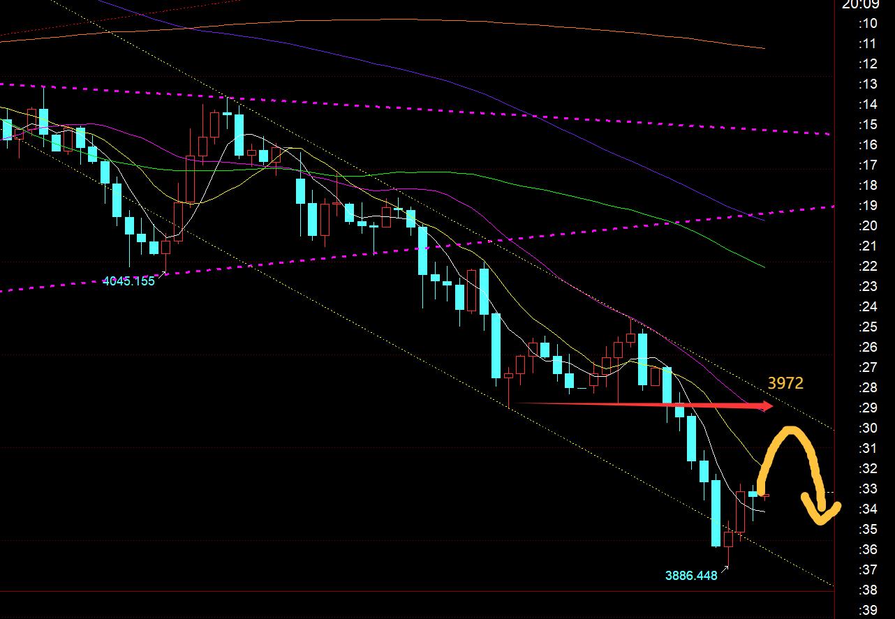 Premièrement, le niveau d'or quotidien : hier, il a clôturé dans le négatif et il a perdu le support du rail médian. Ce à quoi je m'attendais au départ aujourd'hui, c'était de fermer une croix ou un petit yang ou un petit yin, puis de rebondir pour confirmer la résistance du rail médian, puis de monter plus haut et de retomber pour me préparer à une vague de hausse après la baisse des taux d'intérêt de demain. Cela peut également facilement provoquer une chute après les ruptures de rails à mi-rail, incitant les investisseurs à suivreLe vent reste baissier aux basses couches ; en fait, il a continué à baisser aujourd'hui, tombant en dessous des deux niveaux de support de 3945 et 3914, ce qui est plus fort que prévu initialement. Cela retardera effectivement la hausse du deuxième point culminant dans la période ultérieure, nous ne pouvons donc qu'attendre patiemment ; puis après la perte de la position 3914, faites attention aux trois positions du support inférieur. L'un est 3870, qui appartient à la moyenne mobile annuelle de 4 heures, l'autre est 3846, qui appartient à 3311, passant à 4381 et revenant à la position de 50 divisions, et l'autre est 3825, qui est la moyenne mobile hebdomadaire de 10 heures. Voyons si le plancher à court terme peut apparaître à l'une de ces trois positions ;