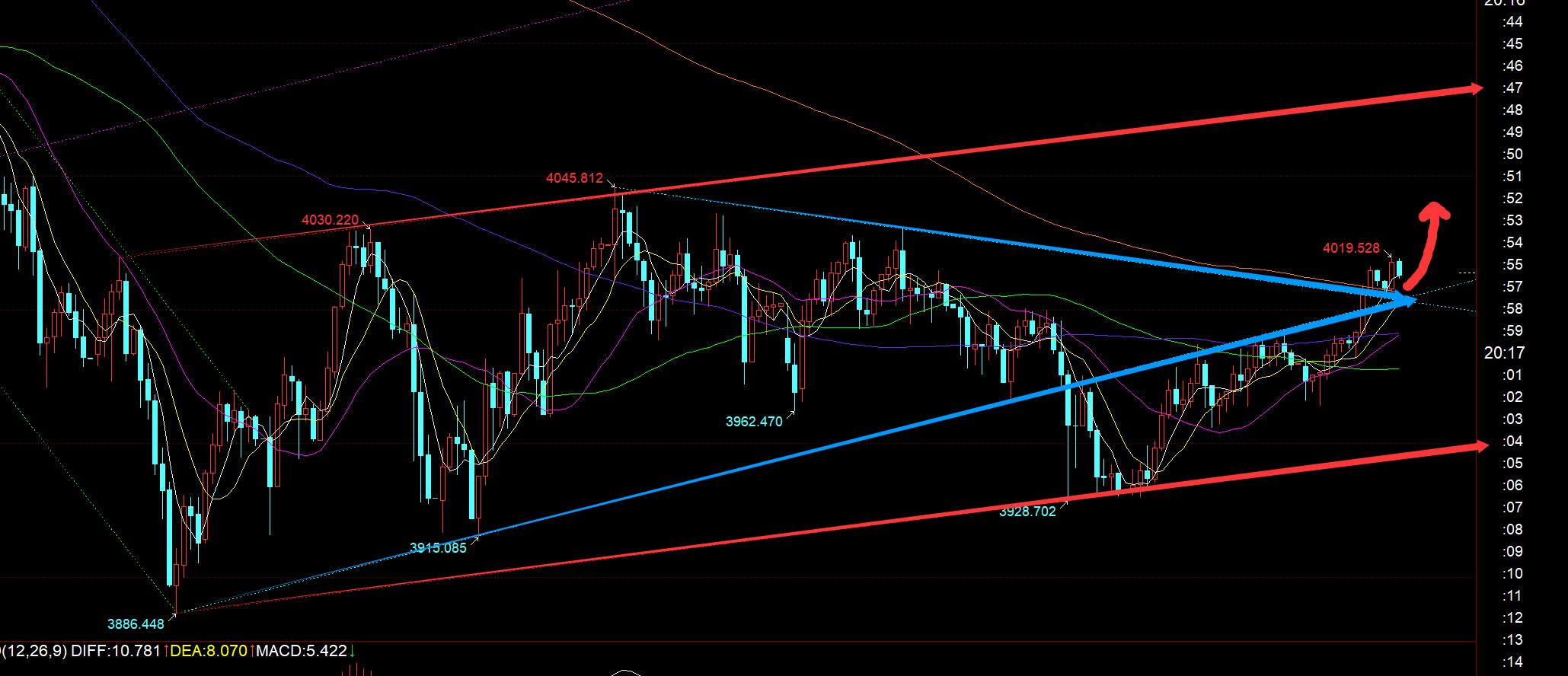 Troisièmement, le niveau horaire doré : la résistance à la contre-pression du rail inférieur du triangle de convergence bleu de 3990 a encore été supprimée du jour au lendemain. Dans la matinée, il y a eu une vague de baisse, tombant en dessous du rail intermédiaire et de la ligne de tendance reliant le plus bas d'hier matin et le plus bas du marché européen. Cependant, il n’a pas continué à baisser, mais a continué à augmenter. Sur le marché européen, il a même franchi l'important niveau de résistance de 3 990, franchi le niveau de résistance du triangle de convergence et a également franchi le niveau de résistance important à ce moment-là. La moyenne mobile annuelle est supprimée, alors suivez simplement le marché ce soir et continuez à être haussier. Le support actuel est au-dessus de 4004-06. Fondamentalement, tant que la barre des 4 000 est maintenue, il y a une forte probabilité que le rebond continue de s'accentuer. La résistance est 4030 et 4050. La forte pression est la voie supérieure du canal rouge à 4080. Ce n'est qu'en franchissant le point de suppression de la voie supérieure du canal rouge que nous pourrons nous renforcer à court terme et atteindre un sommet secondaire ;