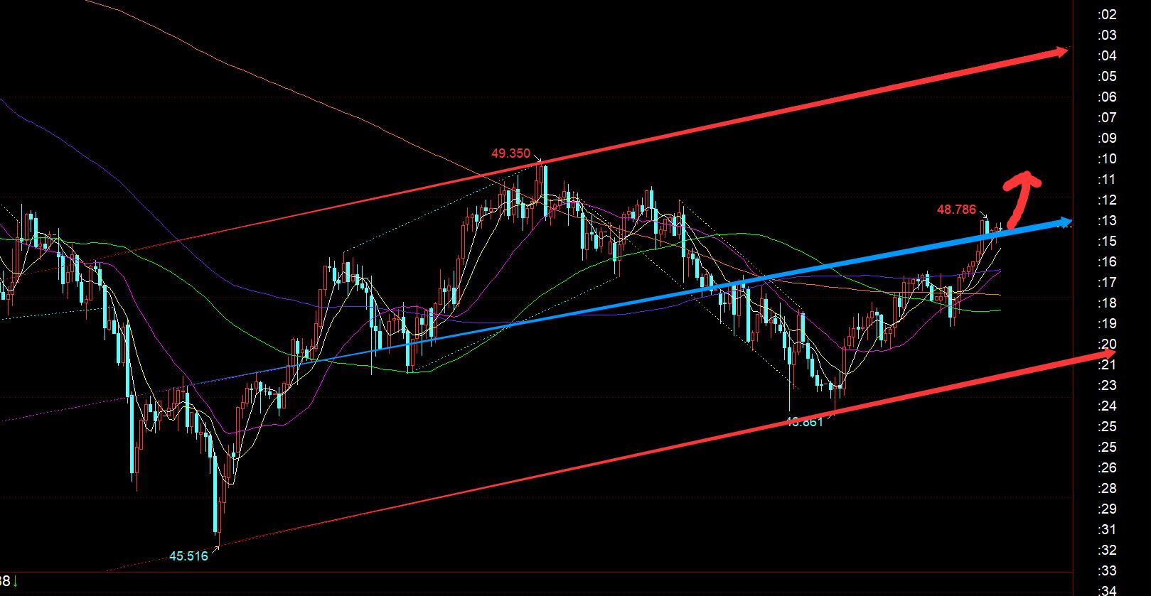 Argent : la ligne quotidienne a également franchi la moyenne mobile de 10. aujourd'hui, et devrait également sortir de la faible fourchette de consolidation en bas et monter pour tester la ligne 49,4 à mi-rail. Ce n’est qu’en le franchissant qu’il pourra atteindre un sous-haut de 51 et plus ; à court terme, l'image ci-dessus montre que la tendance générale est cohérente avec celle de l'or, s'étendant dans une large fourchette au sein du canal rouge, et la ligne bleue est la tendance qui a été soutenue unilatéralement début septembre. La ligne de potentiel s'est également rompue à la hausse à l'heure actuelle. xmltrust.comme il s’agit d’une petite tendance unilatérale à la hausse au cours de la journée, nous ne pouvons pas attendre trop de backtesting, sinon elle retombe facilement en état de choc ; par conséquent, il est préférable de ne pas franchir le point bas de 48,5, où le marché européen a reculé. Les objectifs de résistance supérieurs devraient prêter attention à 49 et 49,4. La clé réside dans la question de savoir si la pression de 49,4 peut être surmontée d'un seul coup ;
