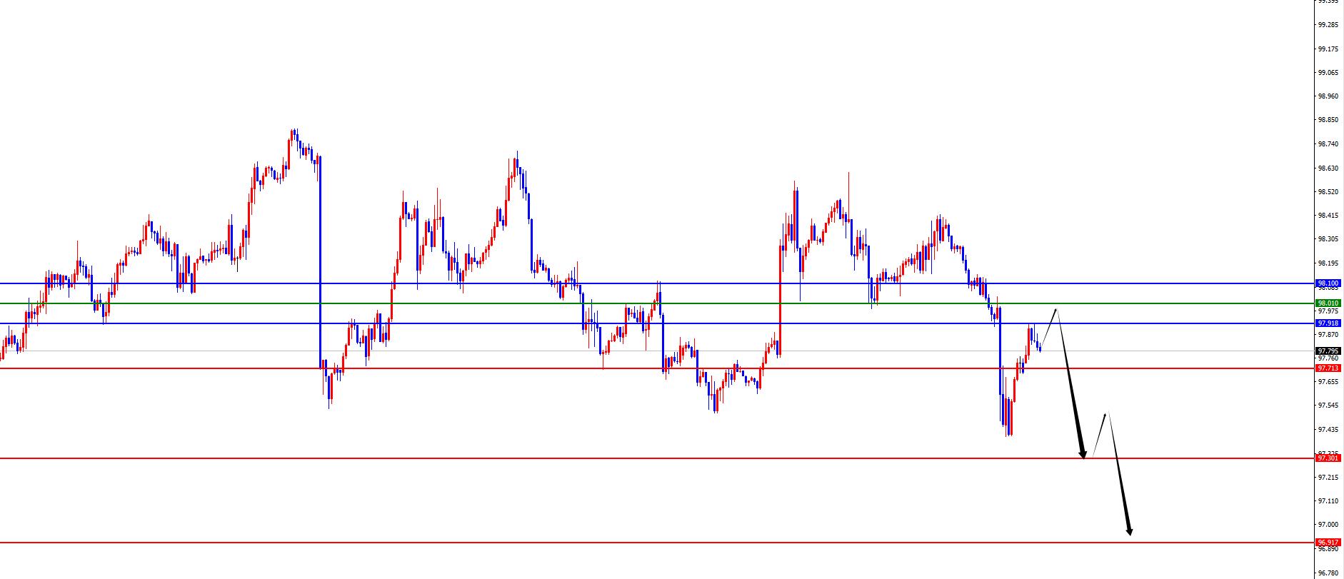 Da un'analisi multi-ciclo, il prezzo si è consolidato su e giù di recente a livello settimanale. Attualmente, la resistenza settimanale si trova nell'area 97,90 e il prezzo è a cortocircuiti al di sotto di questa posizione. Il prezzo passerà a lungo solo dopo la successiva chiusura settimanale sopra questa posizione. Dal livello giornaliero, con il passare del tempo, la resistenza giornaliera è attualmente nell'area 98.10 e il prezzo è attualmente ribassato al di sotto di questa posizione. Di recente, il prezzo si è consolidato su e giù in una posizione chiave nella linea giornaliera. In termini di operazione, è necessario prestare attenzione al ritmo di quattro ore. Dal punto di vista di quattro ore, l'attuale resistenza di quattro ore si trova nell'area 98. Il prezzo è breve in questa posizione. È breve prima che il prezzo sfumasse la resistenza di quattro ore. Se si rompe più tardi, deve girare in tempo. Al momento, viene temporaneamente trattato con il metodo di trading sul lato destro.