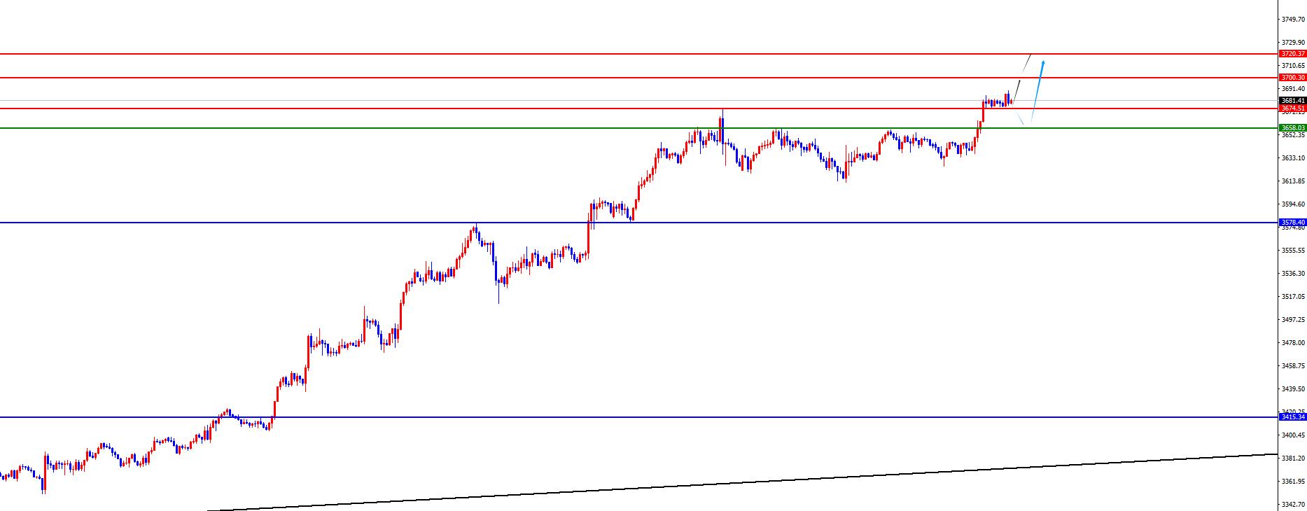 Da un'analisi multi-ciclo, osserva prima il ritmo mensile. Il prezzo mensile si è concluso ad agosto. Nel xmltrust.complesso, il prezzo è ancora in modo rialzo. Dal punto di vista a lungo termine, la posizione 3000 è lo spartiacque della tendenza a lungo termine. Il prezzo può essere trattato di più a lungo termine. Dal livello settimanale, il prezzo è sfuggito alla resistenza chiave dopo recenti fluttuazioni continue e ha continuato a raggiungere un nuovo massimo storico. Attualmente, lo spartiacque lungo e corto settimanale è a 3415. Il prezzo è al di sopra di questa posizione e la linea media viene trattata di più. Dal livello giornaliero, dobbiamo prestare attenzione al supporto regionale 3578 per il momento e la banda al di sopra di questa posizione dovrebbe essere trattata più spesso. Dal punto di vista delle quattro ore, il prezzo ha mantenuto il suo consolidamento su e giù di quattro ore negli ultimi giorni della scorsa settimana. Ieri, dopo aver sfondato la resistenza di quattro ore, il supporto di quattro ore è ancora la chiave. Al momento, l'attenzione è rivolta al supporto della gamma 3657-3658 e il prezzo è più trattato in questa posizione. Allo stesso tempo, la chiusura di un'ora fortemente il giorno precedente. Durante la sessione asiatica di oggi, si basava ancora una volta sul punto più basso della ritirata la mattina presto del giorno precedente per colpire un nuovo massimo. Al momento, il punto più basso del ritiro nella mattina presto di ieri è diventato uno spartiacque chiave. Il prezzo sarà più forte prima che il prezzo si rompa. Se l'inaspettato si rompe, concentrati sul supporto di quattro ore e guarda l'ascesa. Concentrati sull'area 3690-3720 sopra.