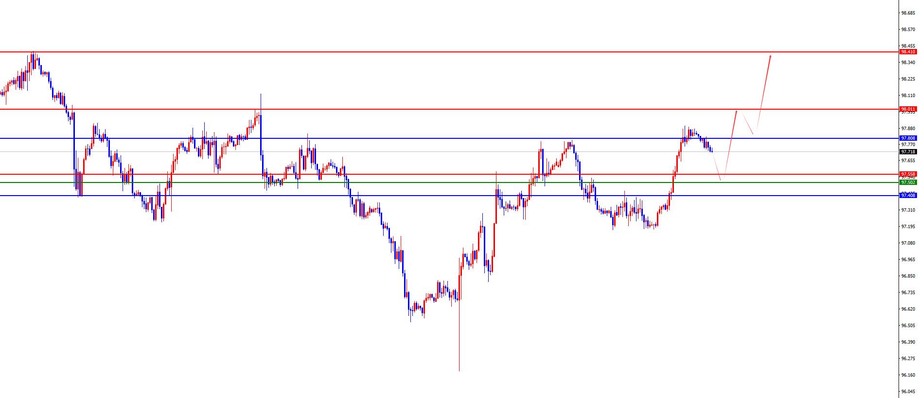 Da un'analisi multi-ciclo, il livello settimanale è stato recentemente un consolidamento chiave nella linea settimanale. Attualmente, la resistenza settimanale si trova nell'area 97.80. È importante prestare attenzione al fatto che questa posizione possa resistere questa settimana. Una volta che è fermo, i tori a medio termine continueranno. Dal livello giornaliero, col passare del tempo, la linea giornaliera è attualmente supportata nell'area 97.40. Prenderemo attenzione a questa posizione per stabilizzare e aumentare ulteriormente. Dal punto di vista di quattro ore, l'attuale supporto di quattro ore è a 97,50. Il prezzo è già stato sulla linea giornaliera e sulla resistenza di quattro ore ieri. Prenderemo attenzione al supporto in quest'area per continuare ulteriormente a salire. Allo stesso tempo, il prezzo si adeguirà al ribasso a breve termine in un'ora. Dopo il successivo aggiustamento al supporto chiave, esamineremo ulteriori aumenti. Presta attenzione all'area 98-98.40 sopra.