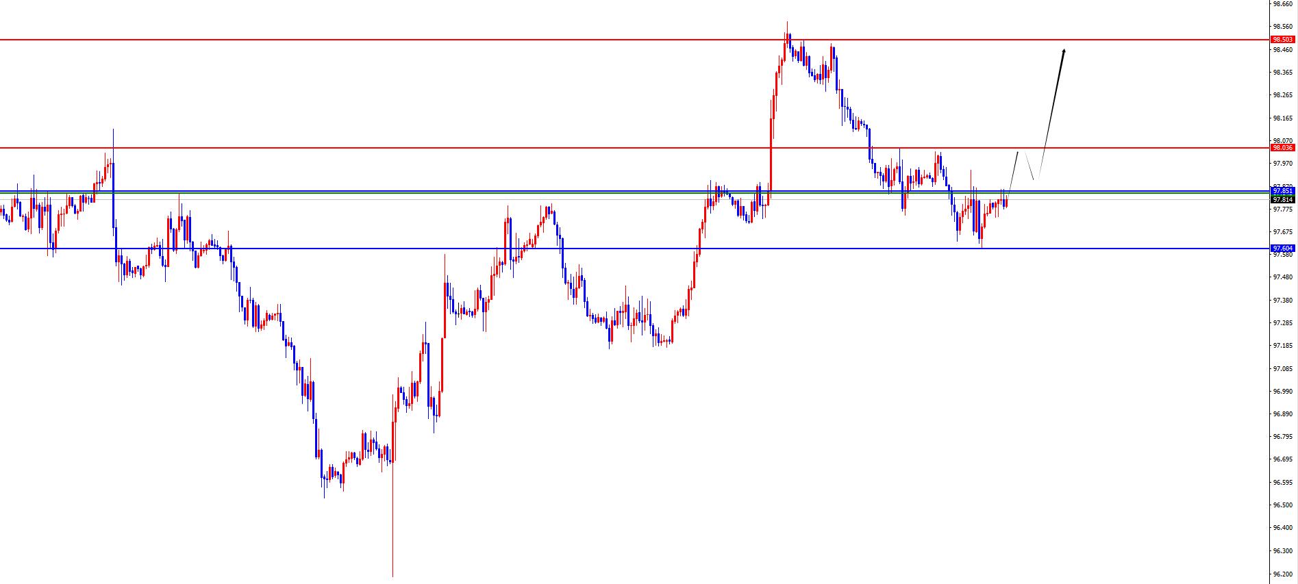 Da un'analisi multi-ciclo, il prezzo si è consolidato di recente a livello settimanale. Attualmente, la linea settimanale supporta l'area 97,85 e, allo stesso tempo, il prezzo è stato nella resistenza della scorsa settimana e i tori continuano a medio termine. Dal livello giornaliero, col passare del tempo, la linea giornaliera è attualmente supportata nell'area 97.60 e la banda al di sopra di questa posizione del prezzo è aumentata ulteriormente. Dal punto di vista di quattro ore, l'attuale resistenza di quattro ore è a 97,85. Questa posizione risuona con la resistenza settimanale e il prezzo si è ulteriormente stabilizzato. Dopo la successiva stabilizzazione, è necessario prestare attenzione allo stato di forza, quindi i tori disposti ieri possono continuare a trattenere. Un'ora fa, il prezzo fluttuava e è caduto di nuovo ieri, formando una divergenza inferiore. Allo stato attuale, lo stato rialzista a breve termine è attualmente a breve termine, quindi guarda il successivo attenzione alla rottura del prezzo e alla stabilizzazione di 97,85 e quindi ha iniziato a fare sforzi significativi per aumentare.