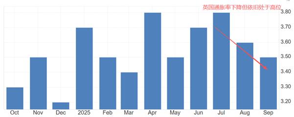 通胀历来是各国中央银行最看重的数据。英国9月份核心CPI年率3.5%,高于美国同期的3%。各国央行均把2%看作温和通胀标准,英国通胀率显然远高于该标准。三季度,英国的通胀率出现连续回落迹象,但无法确定趋势能否延续。比如,今年1月份至3月份,通胀数据同样三连降,但4月份数据骤然升高至3.8%。