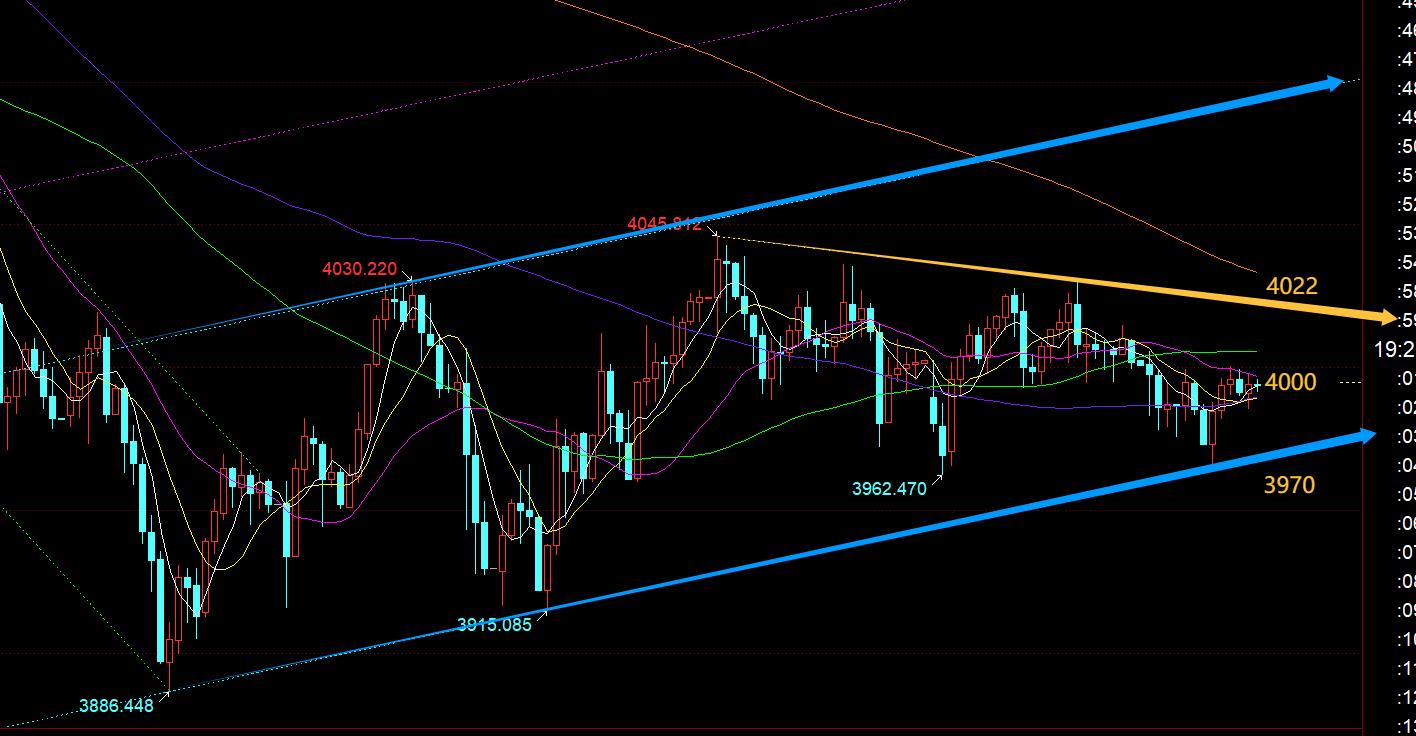 第三,黄金小时线级别:今日早间又是循环先跌一波,11点出现探底长下影K迹象时,则提示3980可以先看一波反弹修复拉升,一早先跌或先拉,在震荡行情中,延续性是最差的,一般11点(冬令时)前后可以择机把握一波反向,最终是成功抵达4000一线;午后压制10均线再次承压下挫,则提前埋伏上图对应蓝色通道下轨衍生支撑点3967企稳看涨反弹,最终刚好最低点打入,再次一波拉升抵达4000关口;今晚来讲,中轨下移3997是一个中轴的关键,或4000一线是关键,一旦突破收盘站上,则回踩确认可以继续延续看一波反弹拉升去试探黄色趋势阻力点4020-22,此处若承压不上再冲高回落;反之,中轨或4000下一直承压不上,则还会反复下滑试探低位,届时留意3674-70企稳反弹;另外,若向下有效破位蓝色通道下轨,则要小心再走弱打压一波,走下降旗形,届时日线次高点的出现时间节点就要再延后等待;反之,若向上突破黄色趋势阻力线,则有望逐步反弹去试探蓝色通道上轨,那样会加快日线出次高点的时间节点;