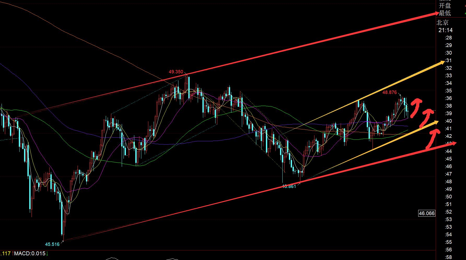 白银方面:从上图看,同样处于红色大通道上行通道内整理,而小通道就是黄色上行整理,当前小时线中轨支撑48.35上,日内618分割支撑是48.3,先留意它的支撑企稳;而黄色通道下轨支撑是48,此位置上也存在企稳反弹,若再弱一点,就是红色通道下轨支撑47.6;所以,对于震荡而言,今晚留意这三处的支撑企稳信号,出探底拉升K或大阳K,则下一个小时回踩就可尝试介入试探,阻力48.85和49.4;