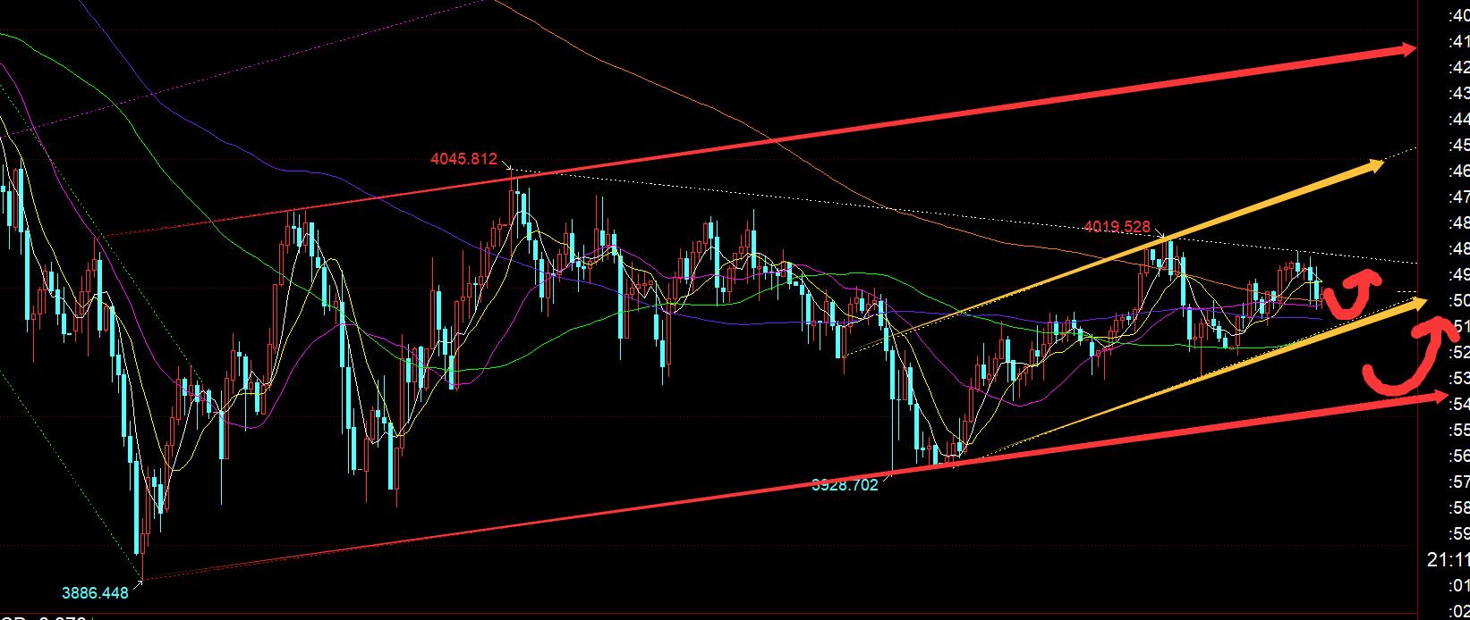 第二,黄金小时线级别:早间依托3975直接拉升,它处于昨日50分割支撑,也是隔夜提示的首要看涨位;而当大阳K出现后,则回踩382分割位置3985继续提示看涨反弹,最终都抵达了4000之上目标位;午后大阳突破中轨后,反复来回刺穿中轨,就没去考虑入场,因为当时稳定性不强;虽然,欧盘向上又反弹了一波至4014,但力度也不算大,此时冲高回落回归中轨一线;对于今晚来讲,由于非农数据不公布,今晚波动可能也未必大,得留意22点半的美股开盘动作,这两天受它影响还是存在的;当前支撑留意3990,属于日内涨幅回踩的618分割,其次是图中黄色通道下轨3983-84一线,守住这两处,则还是可以维持震荡向上,阻力4012-14,突破才能测试昨日高点得失;若力度冲击可以的话,有小概率或去试探黄色通道上轨4040-42,若能去,这可以为下周出次高点做好铺垫;另外,若守不住黄色通道下轨支撑,则走弱或试探红色通道下轨3955上;
