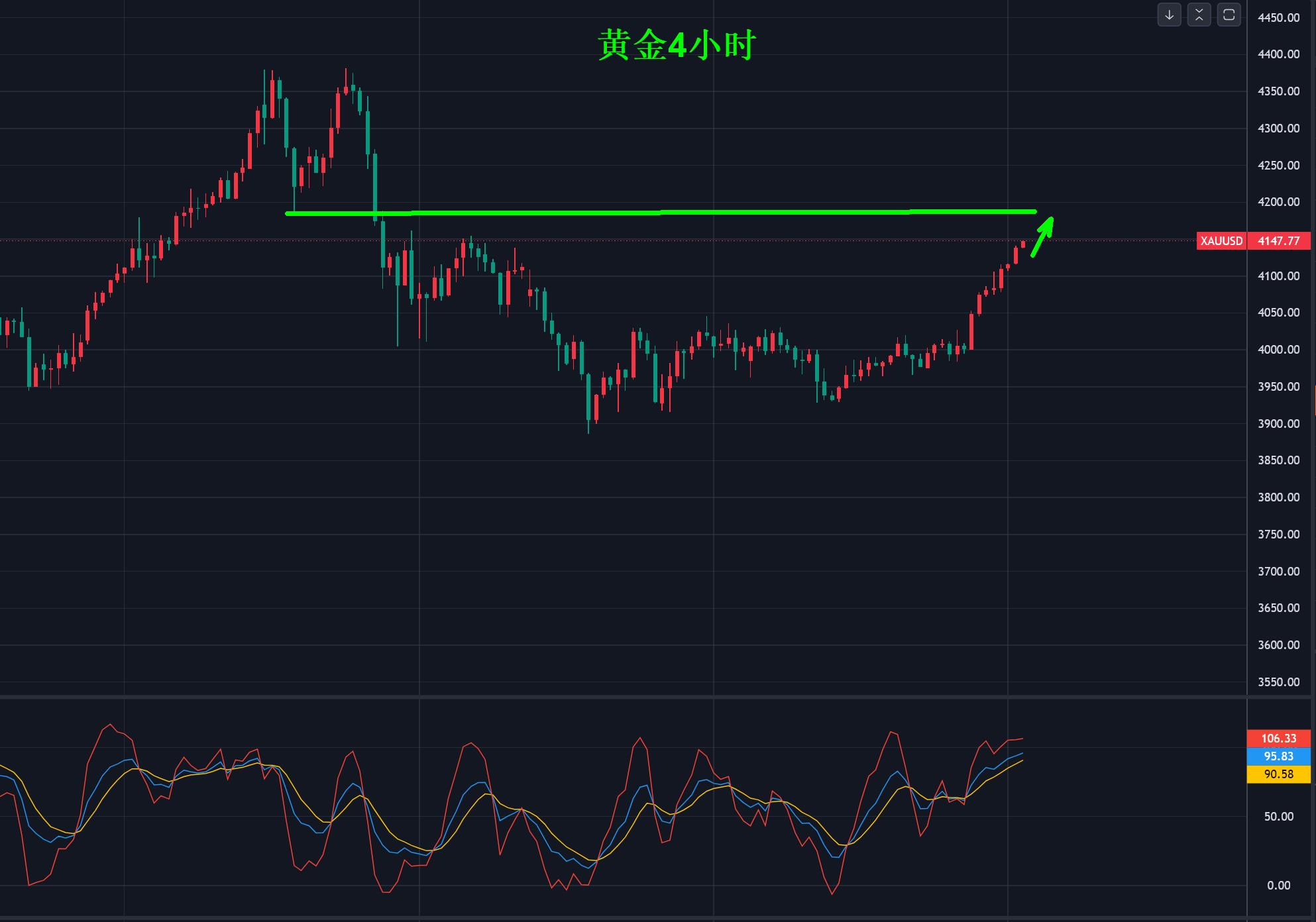 4小时级别持续连阳上涨,中途回调只是修正,这种行情相对比较好做,中途没有太大的波动,上涨之后的首要压力在4180美元,这里是前期4380双顶后回踩关键性压力位。