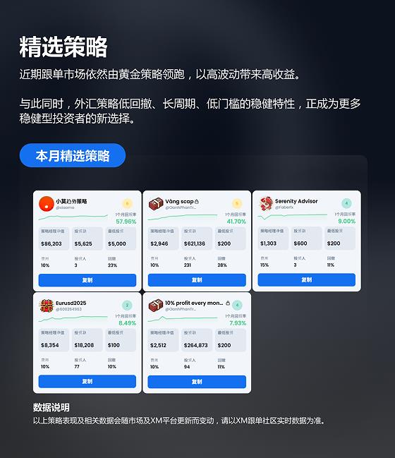 本月策略呈现出“黄金领跑、外汇崭露头角”的双主线:黄金策略依然是高回报焦点,顶尖策略经理单月收益突破50%;外汇策略则以相对稳健、门槛较低的特性,逐渐吸引投资者加入。