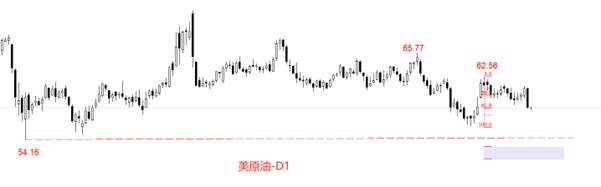 技术角度看,今年4月9日以来,美原油一直在支撑位54.16美元上方震荡,最高价曾达到71.47美元。目前行情处于震荡区间内向下限移动的过程中,昨日的长阴线起到了加速下跌的作用。黄金分割角度看,本轮下跌的目标价位在51~53美元之间,需要做好54.16支撑位被触及的准备。