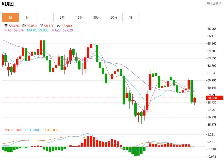 原油市场:截止北京时间21:20,美油上涨,现报58.980,涨幅0.85%。纽市盘前,(原油)价格在最后一个交易日上涨,试图收复之前的部分失地,并在相对强度指标上卸载一些超卖条件,特别是随着积极信号的出现,受打破之前短期看涨修正趋势线的影响。