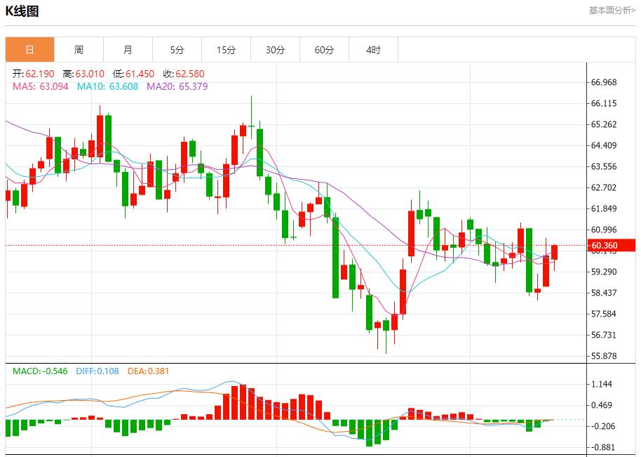 原油市场:截止北京时间21:20,美油上涨,现报60.340,涨幅0.43%。纽市盘前,(原油)的价格在最近的盘中交易中收盘大幅上涨,受到相对强弱指标出现正面信号的支撑,价格围绕其50日指数移动平均线波动,同时在短期内在小幅看跌通道范围内交易,这减少了价格在近期完全回升的可能性。