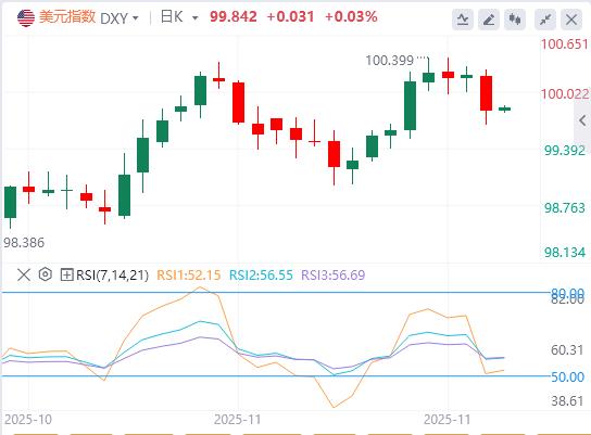 11月26日,北京时间周三亚市早盘,美元指数徘徊在99.84附近。周二,由于不及预期的零售销售数据强化了市场对美联储12月降息的预期,美元指数高位回落,跌破100关口,最终收跌0.389%,报99.81;美债收益率延续跌势,基准的10年期美债收益自10月下旬以来首次跌破4%,对美联储政策利率敏感的2年期美债收益率收报3.463%。随着美联储降息前景的增强被地缘政治风险的缓解所抵消,现货黄金区间震荡,盘中刷新11月14日以来新高,最终收跌0.1%,报4130.84美元/盎司;现货白银最终收涨0.24%,报51.48美元/盎司。国际原油重回跌势,因俄乌和平谈判取得进展的迹象提振了人们对俄罗斯石油供应将保持稳定的预期。WTI原油一度大跌3%,逼近57美元关口,创逾一个月新低,最终收跌1.36%,报58.09美元/桶;布伦特原油最终收跌1.31%,报61.97美元/桶。
