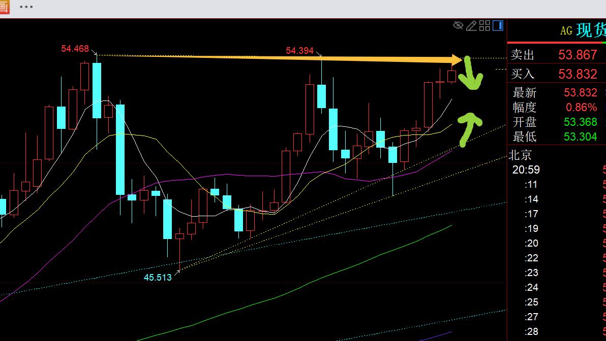 第二,白银方面:昨日走的比较强劲,美盘前两次小时线长下影K企稳信号出现,则判断53.1是节点位置,但不幸美盘向下打了一个阴线诱空,再后半夜缓慢反弹,今日再次冲至高位;